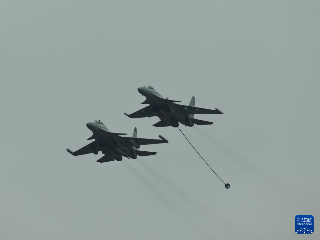 11月12日,海軍殲-15系列艦載戰(zhàn)斗機(jī)編隊(duì)在第十五屆中國(guó)航展上展示伙伴加油課目。新華社發(fā)(呂志浩攝)