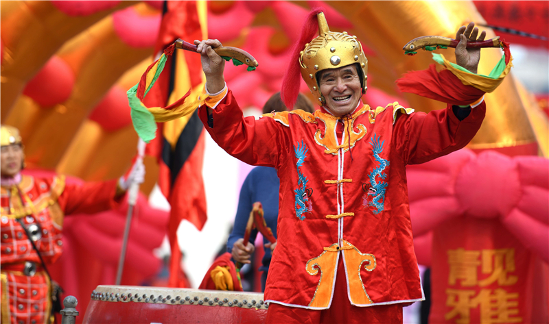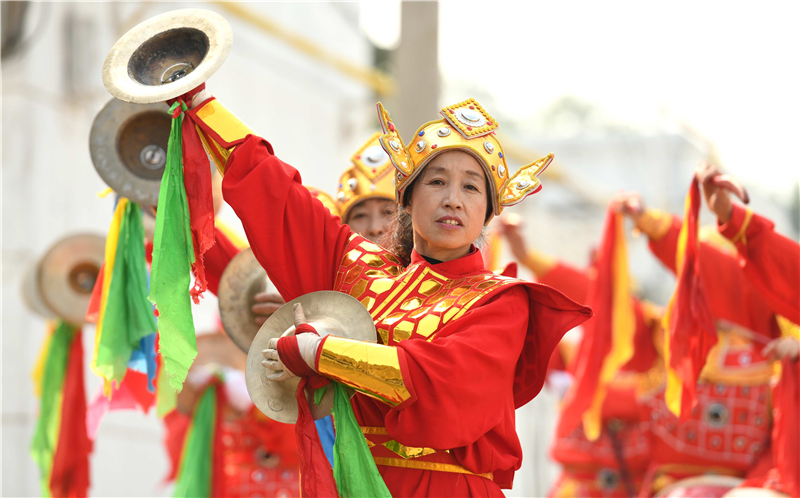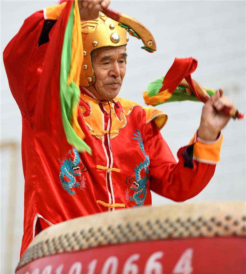 10月10日,正定常山戰鼓代表性傳承人張書社在石家莊市藁城區增村鎮小果莊村表演。