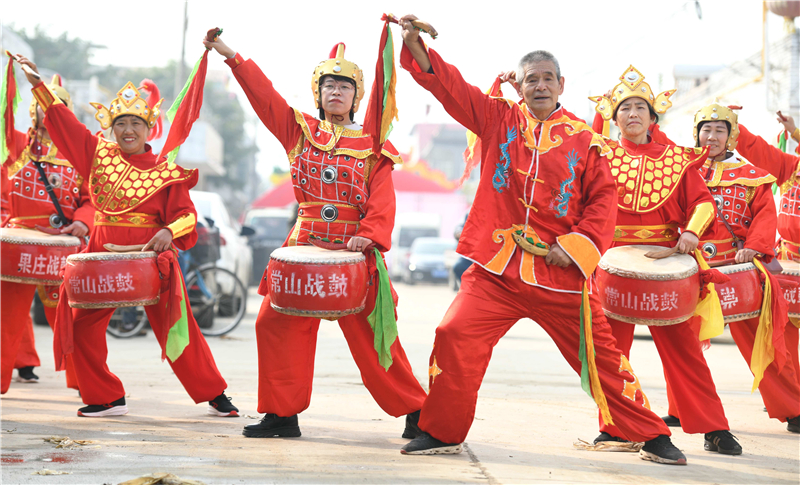 10月10日,正定常山戰鼓表演隊員在石家莊市藁城區增村鎮小果莊村表演。
