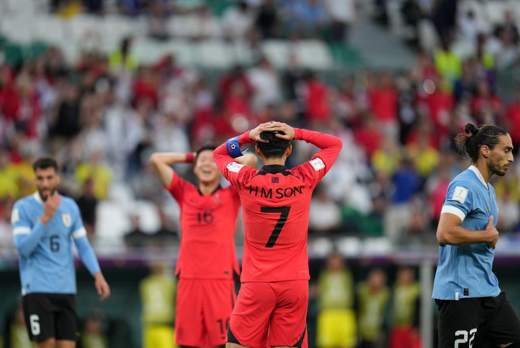 11月24日,韓國隊球員孫興民(右二)在隊友黃義助(左二)錯失進球良機后。新華社記者孟鼎博攝