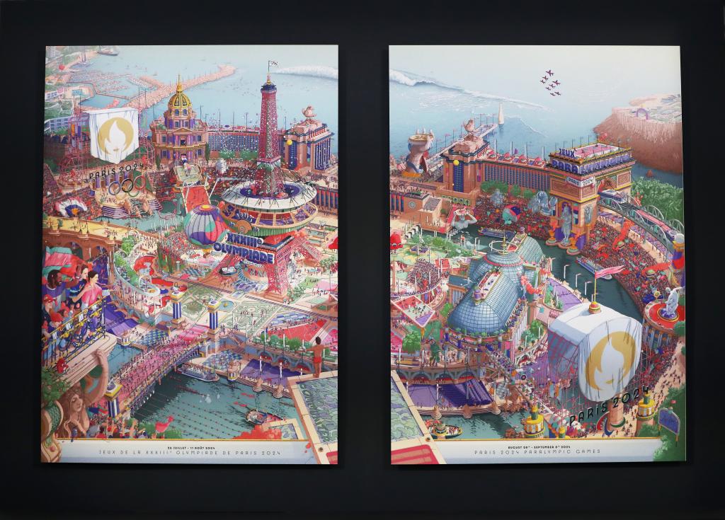 2024年3月5日,由法國插畫藝術家烏戈·加托尼創作的巴黎奧運會和殘奧會官方海報在巴黎奧賽博物館正式發布。新華社記者 高靜 攝