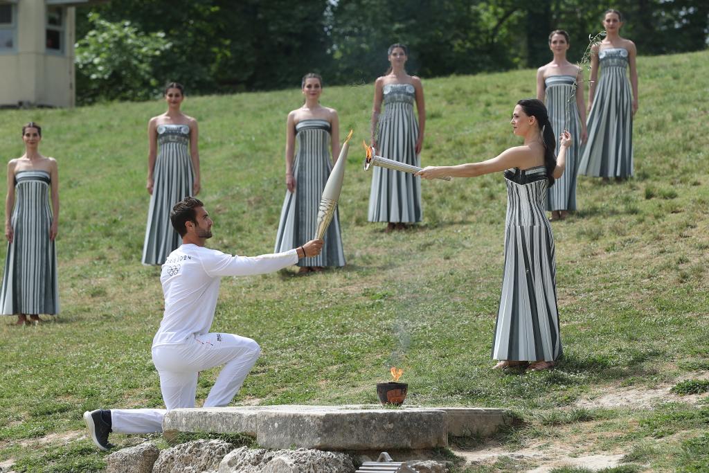 4月16日,扮演最高女祭司的演員瑪麗·米娜(前右)點燃第一棒火炬手——希臘運動員、東京奧運會男子賽艇項目金牌得主斯特凡諾斯手中的火炬。新華社記者 趙丁喆 攝