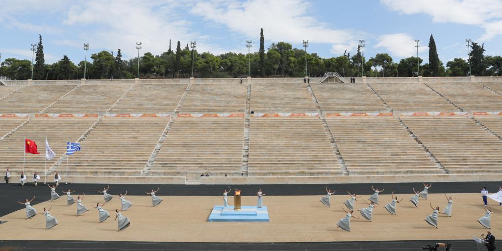 2021年10月19日,北京冬奧會火種在希臘首都雅典的帕納辛奈科體育場,由希臘奧委會交接給北京冬奧組委。新華社記者 鄭煥松 攝