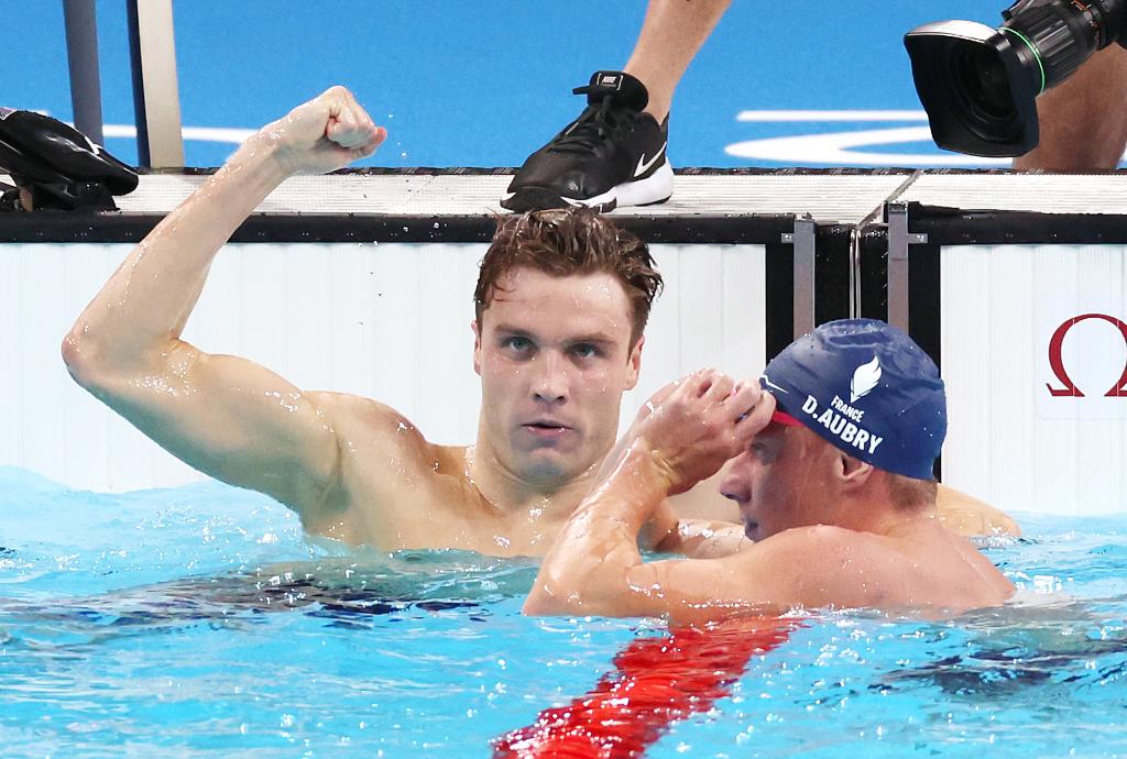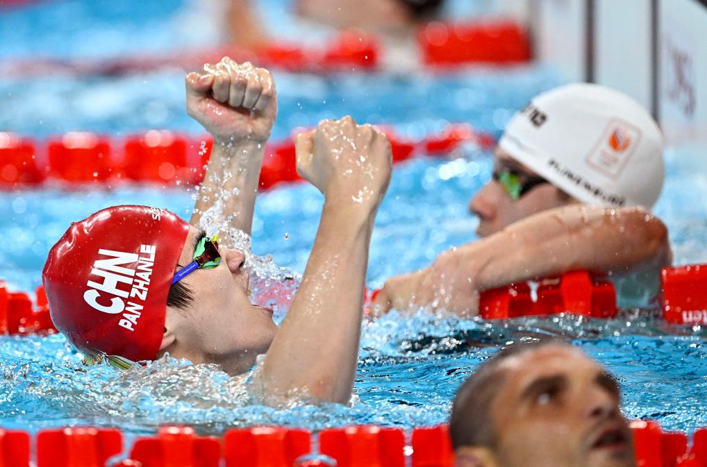 8月4日,中國隊選手潘展樂(中)在奪冠后慶祝。新華社記者 王鵬 攝