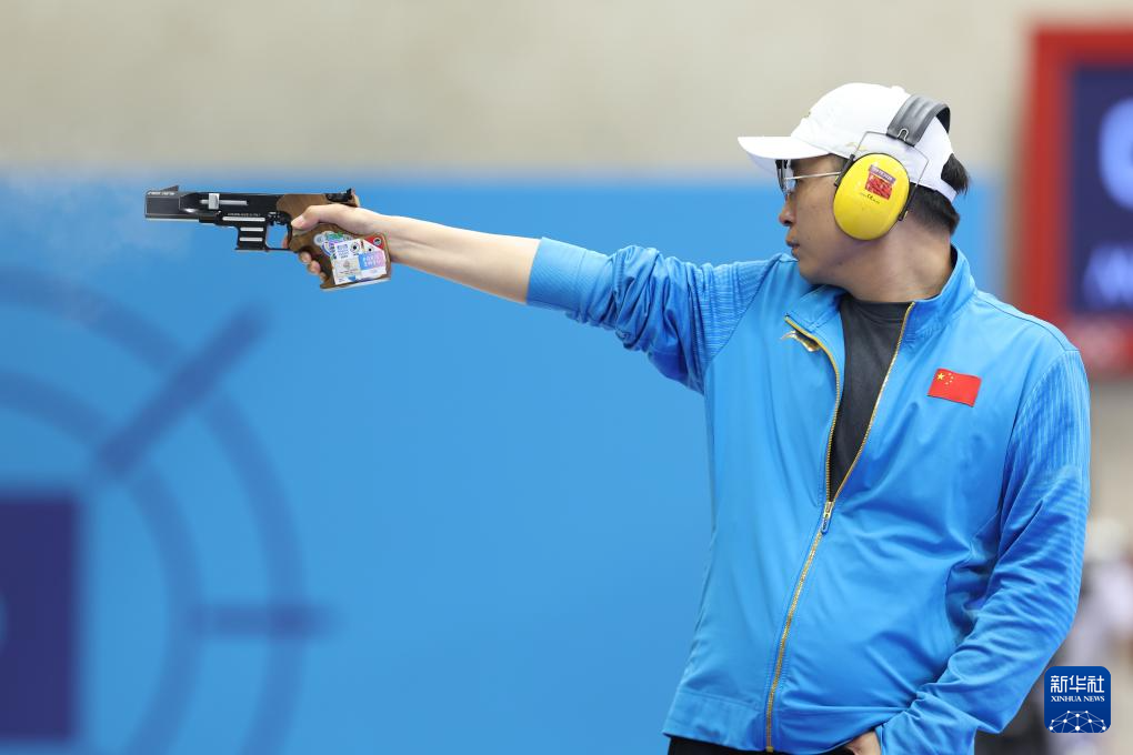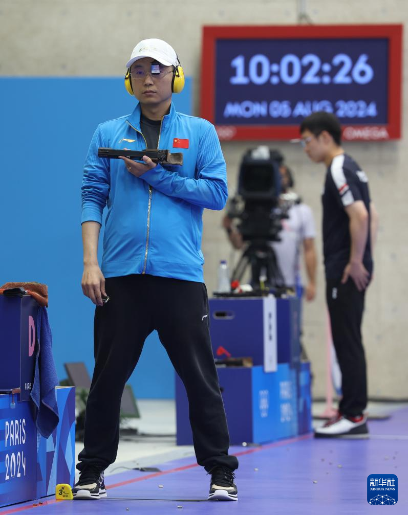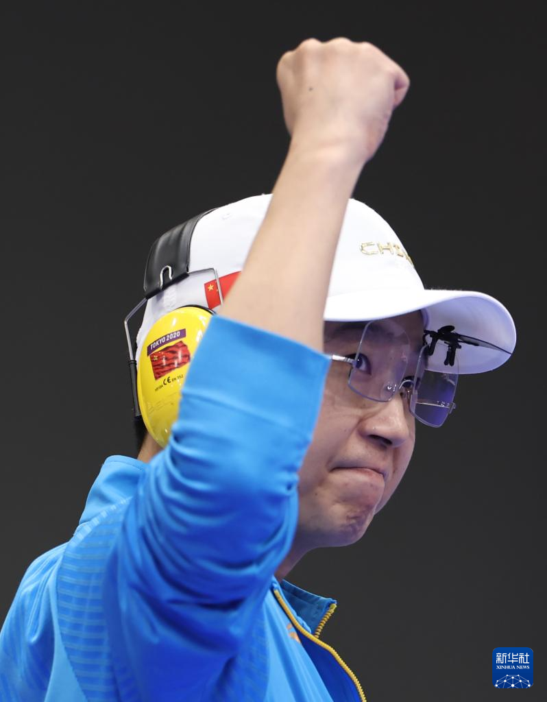 8月5日,中國選手李越宏在最后一槍后慶祝。新華社記者 張帆 攝