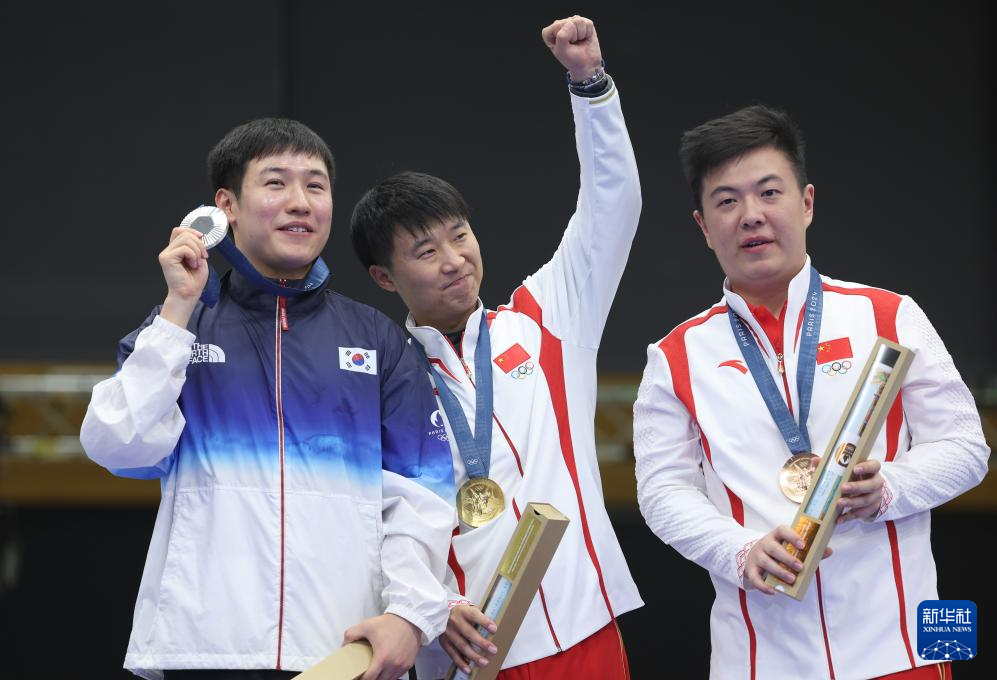 8月5日,冠軍中國選手李越宏(中)、亞軍韓國選手趙永宰(左)和季軍中國選手王鑫杰在頒獎儀式上。新華社記者 趙丁喆 攝