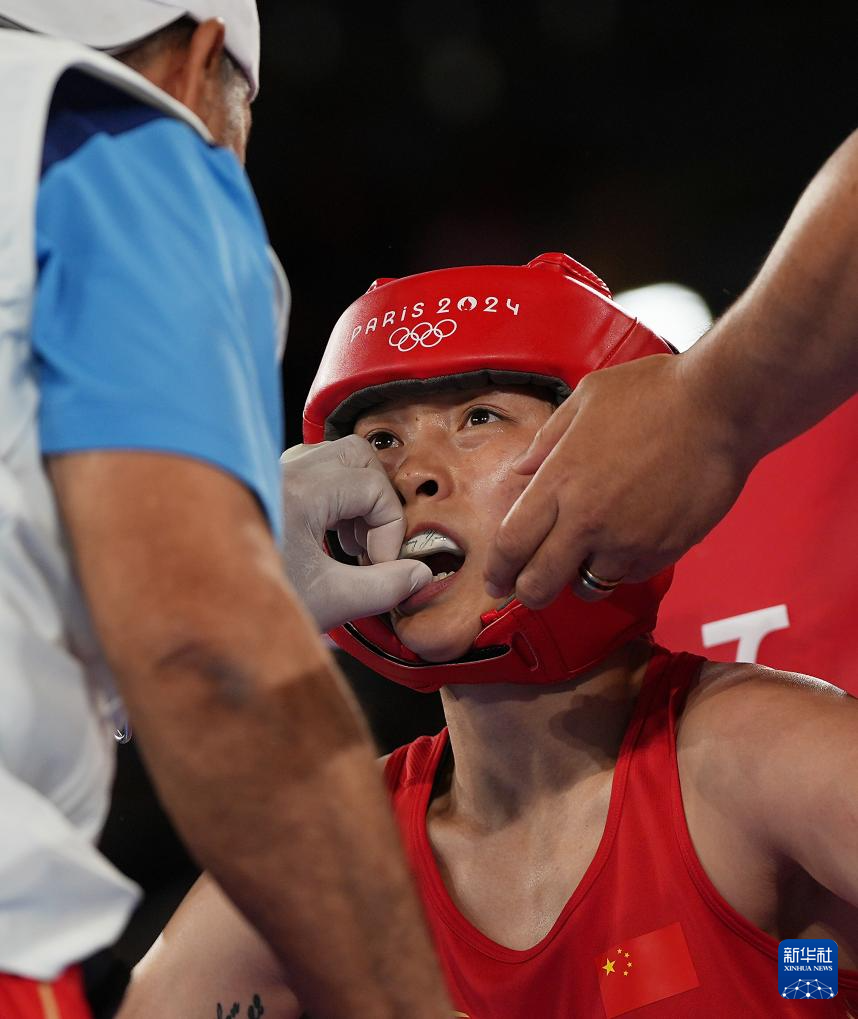 8月8日,常園(右)在比賽間隙檢查牙套。新華社記者 江文耀 攝
