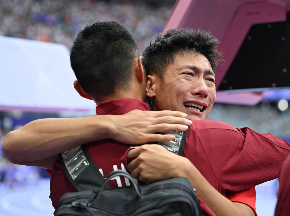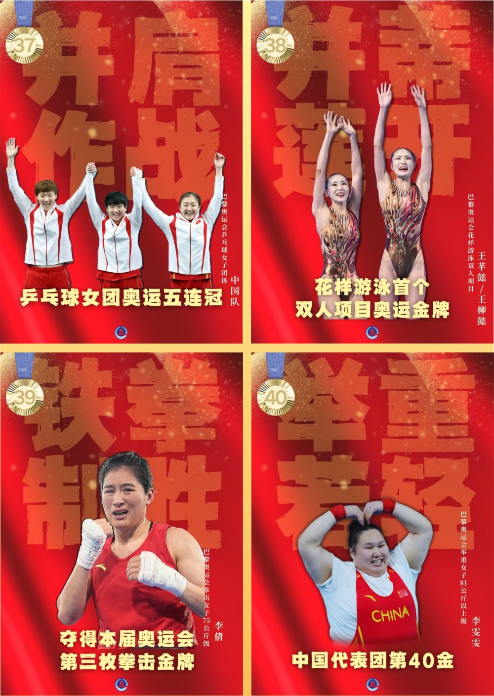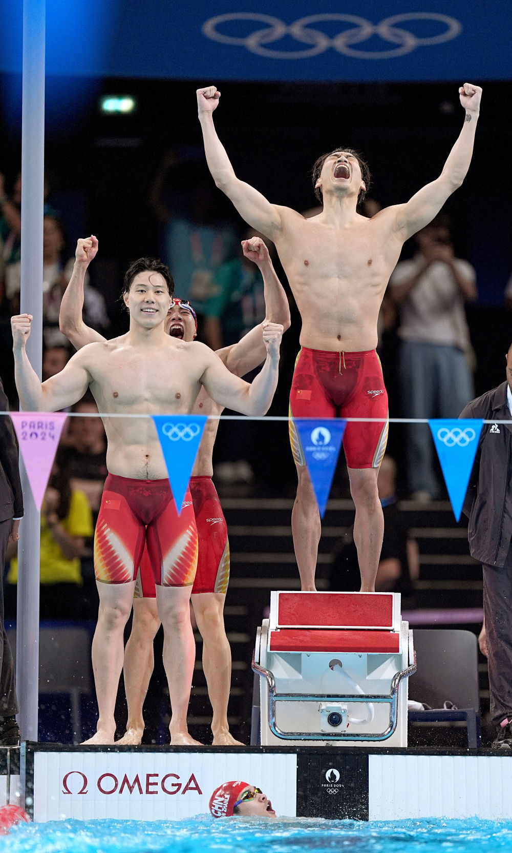 ↑8月4日,由徐嘉余(上右)、覃海洋(上左)、孫佳俊(上中)、潘展樂組成的中國隊奪得游泳男子4x100米混合泳接力冠軍。這枚金牌打破了美國隊在這個項目上長達40年的壟斷。