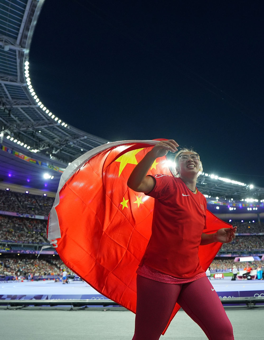 ↑8月5日,馮彬在奪得女子鐵餅亞軍后慶祝。