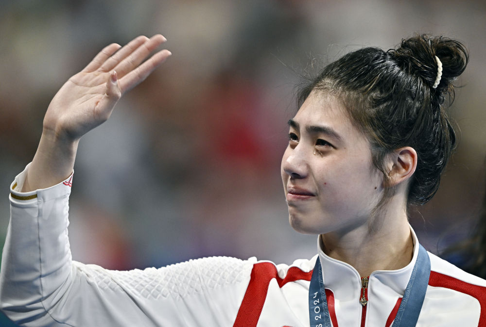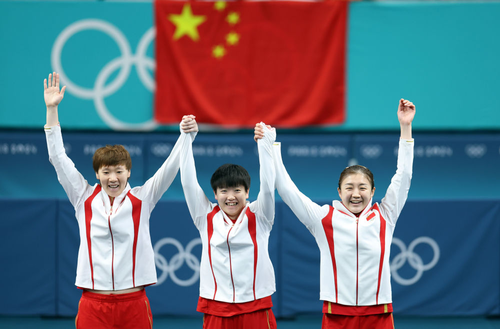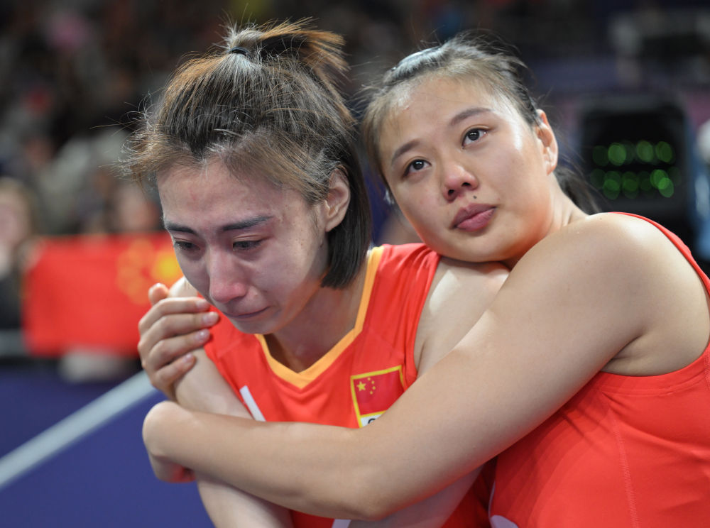 ↑8月3日,孫穎莎(左)獲得乒乓球女子單打亞軍后與冠軍、隊友陳夢擁抱。