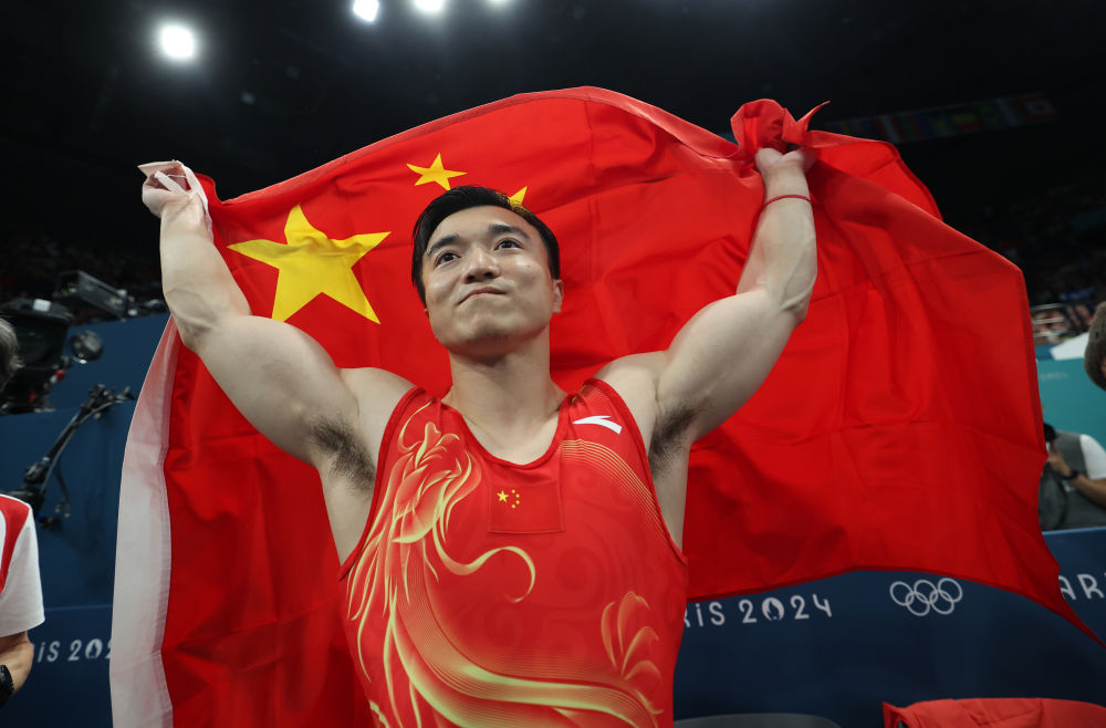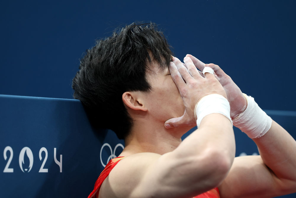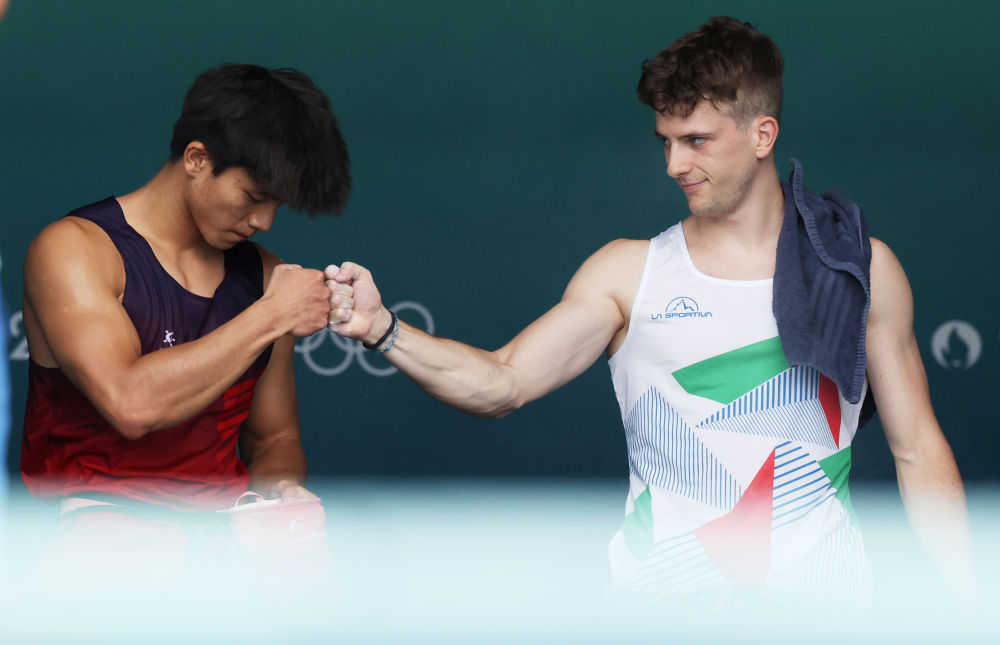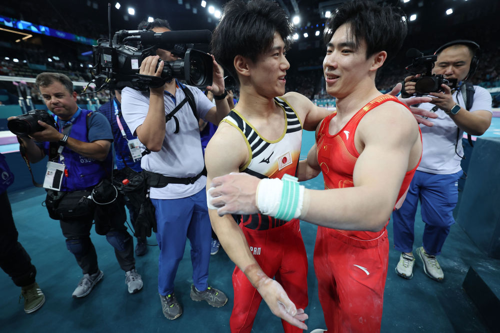 ↑7月29日,在體操男子團體決賽中,中國隊選手張博恒(右二)在單杠比賽后與日本隊選手橋本大輝(右三)相互致意。