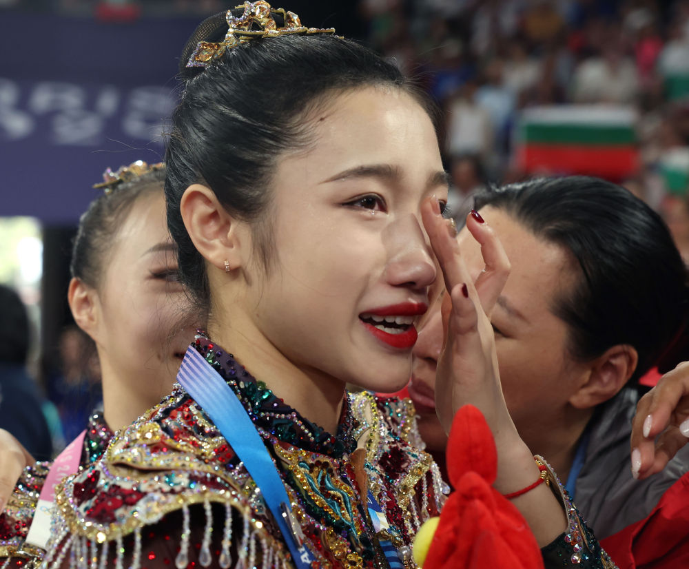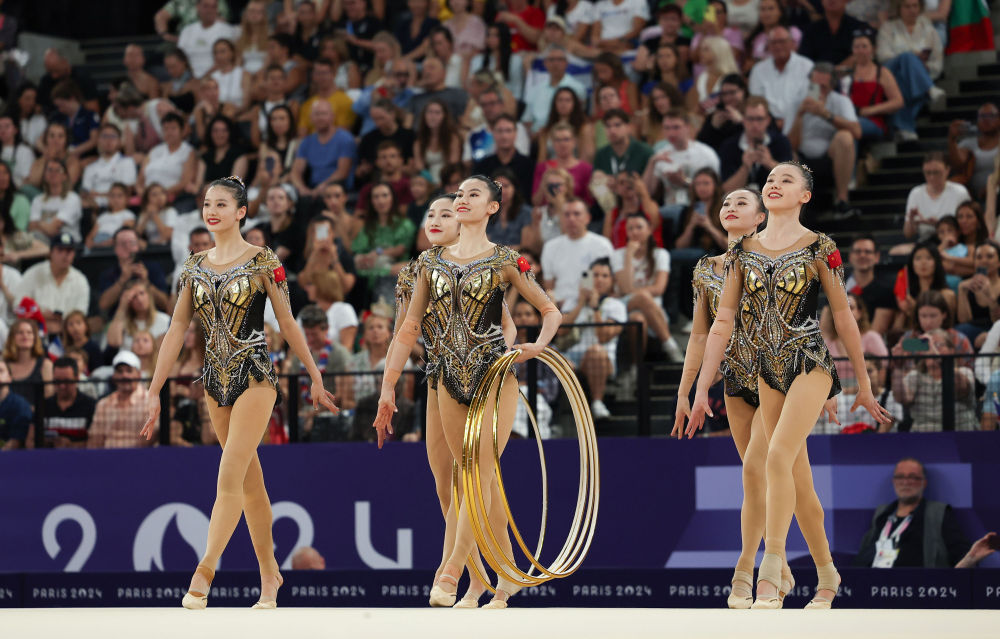 ↑8月10日,中國隊奪得藝術(shù)體操項目集體全能冠軍。這是中國藝術(shù)體操隊首次獲得奧運金牌。