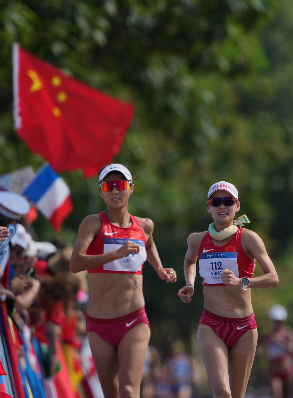↑8月1日,劉虹在女子20公里競走比賽中。37歲的劉虹五戰(zhàn)奧運賽場,當被一騎絕塵的隊友楊家玉“套圈”時,她笑著為楊家玉加油。