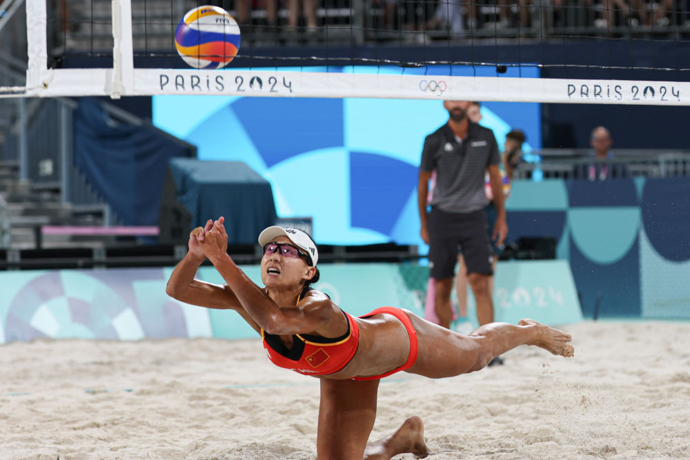 ↑8月1日,薛晨在女子沙灘排球小組賽中救球。35歲的薛晨第四次參加奧運會。
