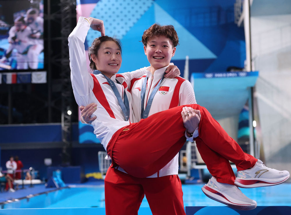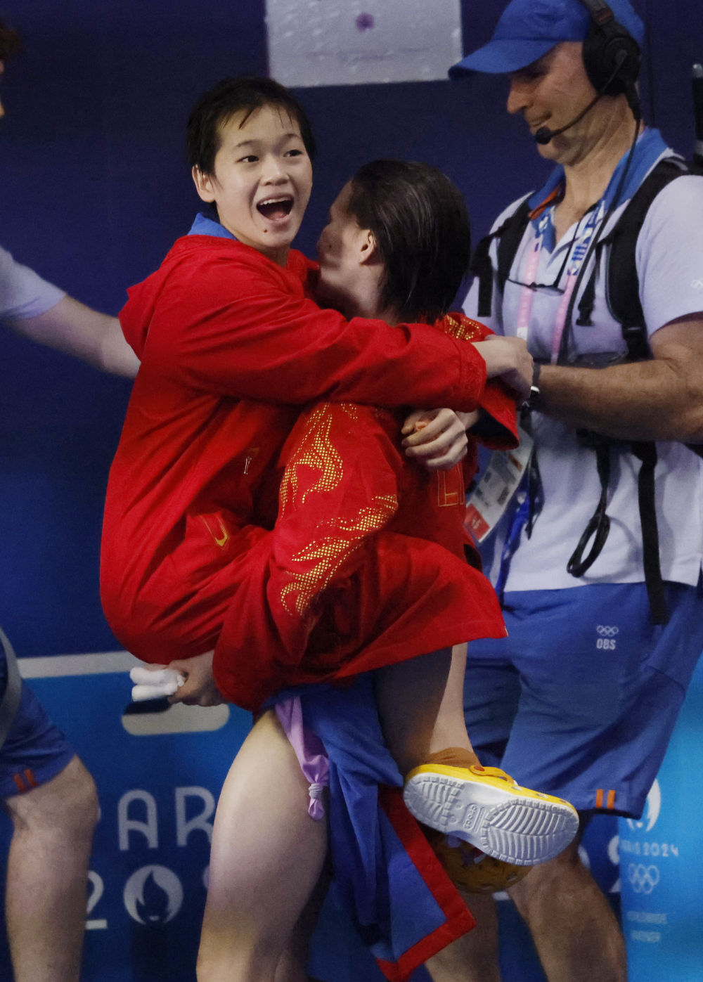 ↑7月31日,跳水女子雙人十米臺冠軍手陳芋汐/全紅嬋(左)擁抱慶祝。