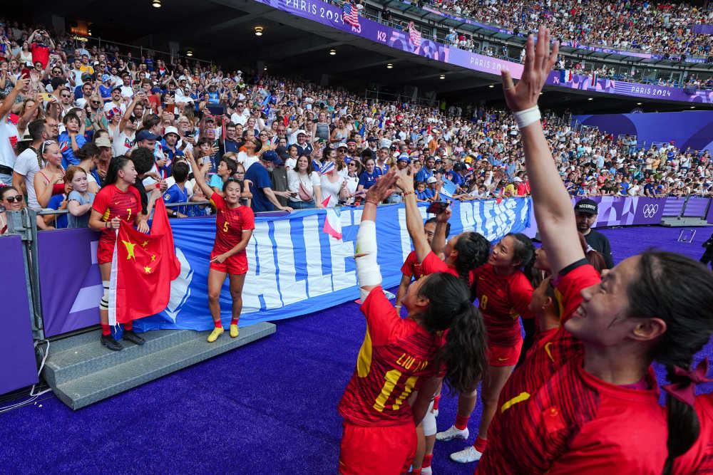 ↑7月30日,在七人制橄欖球女子五、六名排位賽后,中國隊球員向觀眾致意。