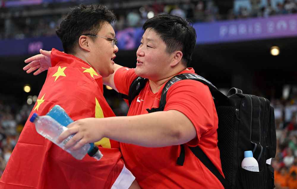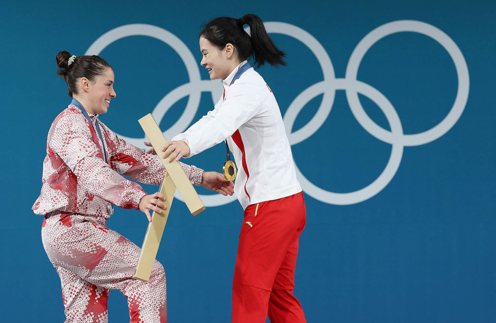 ↑8月8日,在女子舉重59公斤級頒獎儀式上,冠軍中國選手羅詩芳(右)與亞軍加拿大選手沙朗擁抱。