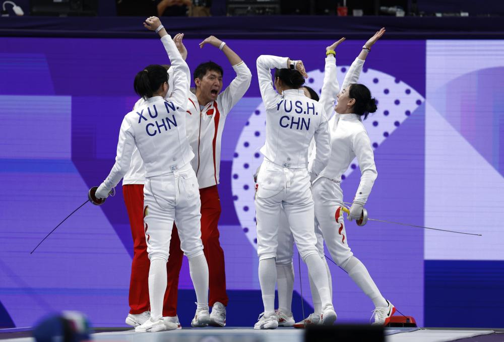 ↑7月30日,在女子擊劍團體重劍半決賽前,中國隊隊員相互鼓勁。