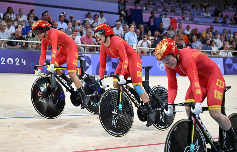 ↑8月5日,在場地自行車女子團體競速資格賽中,由鮑珊菊、郭裕芳和苑麗穎組成的中國隊排名第五,順利晉級。