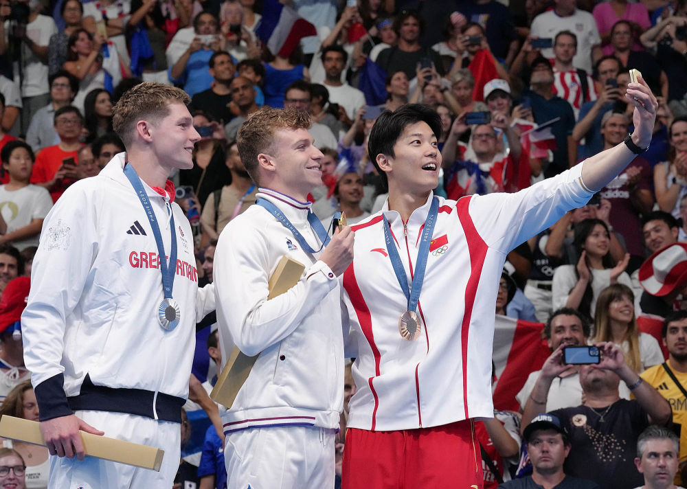 ↑8月2日,在游泳男子200米個人混合泳頒獎儀式上,季軍中國選手汪順(右)與冠軍法國選手馬錢德(中)、亞軍英國選手斯科特自拍。