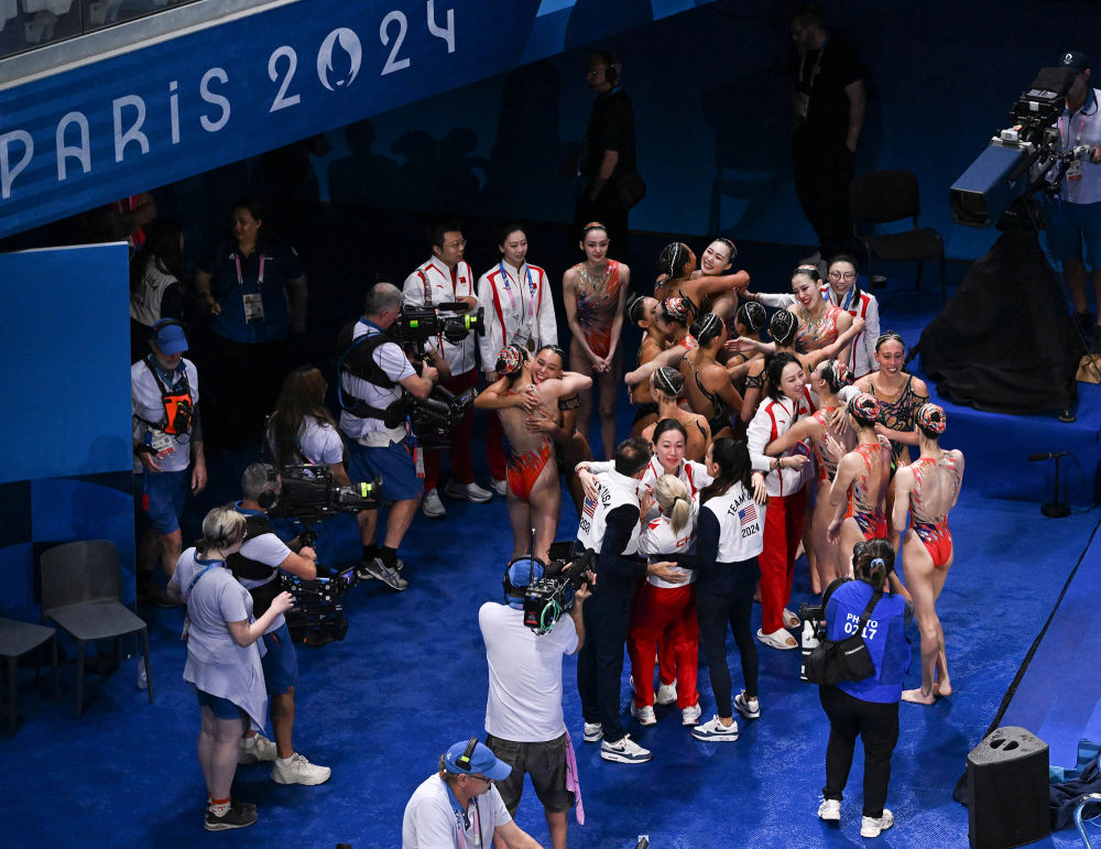 ↑8月7日,中國隊奪得花樣游泳集體項目冠軍后與亞軍美國隊擁抱致意。
