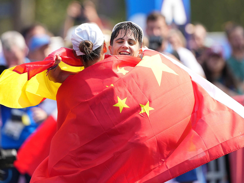 ↑8月1日,楊家玉奪得女子20公里競走冠軍后慶祝。