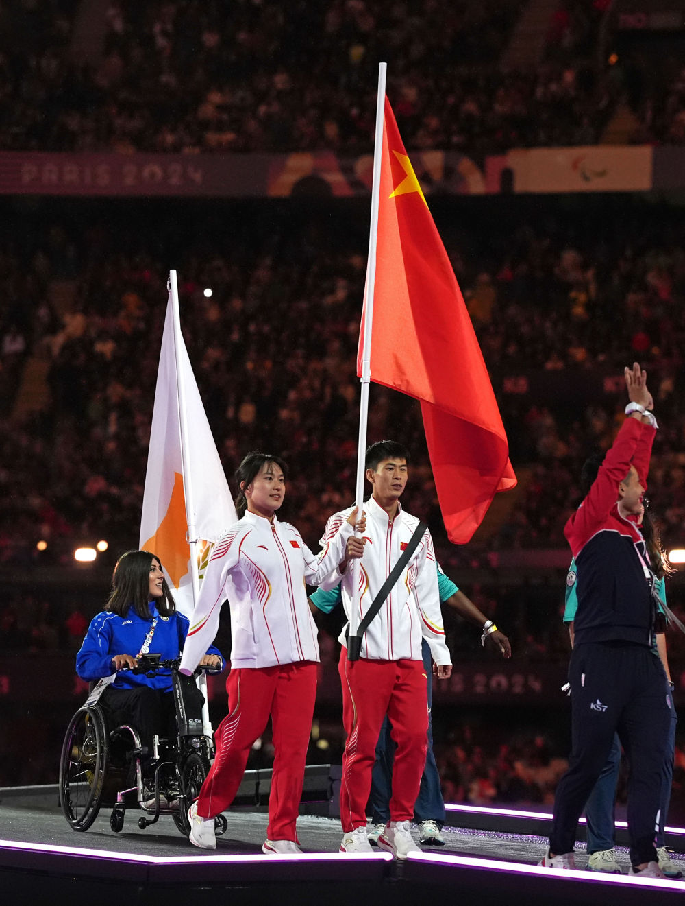 ↑9月8日,中國體育代表團旗手殘奧田徑運動員邸東東(右)和殘奧游泳運動員蔣裕燕在閉幕式上入場。新華社記者 黃偉 攝