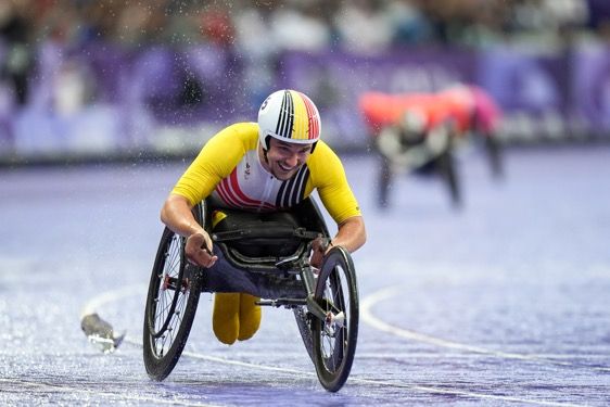 ↑8月30日,比利時選手卡賓在田徑男子400米T52級決賽中冒雨前行。新華社記者 張鋮 攝