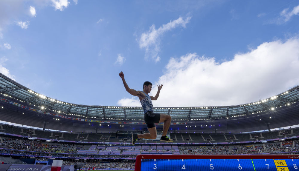 ↑8月30日,中國選手邸東東奪得田徑男子跳遠T11級別冠軍,打破塵封十年的世界紀錄。 新華社記者 黃偉 攝