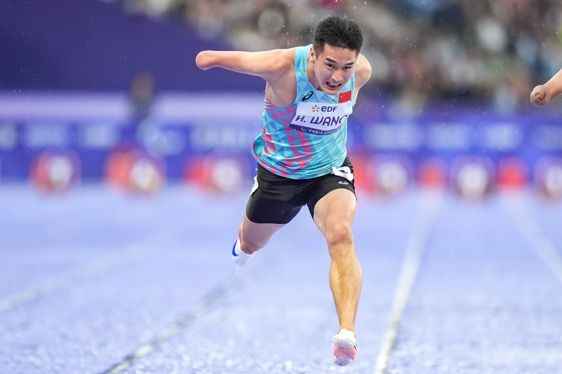 ↑8月30日,中國選手王浩在巴黎殘奧會田徑男子100米T47級決賽中沖刺。新華社記者 張鋮 攝