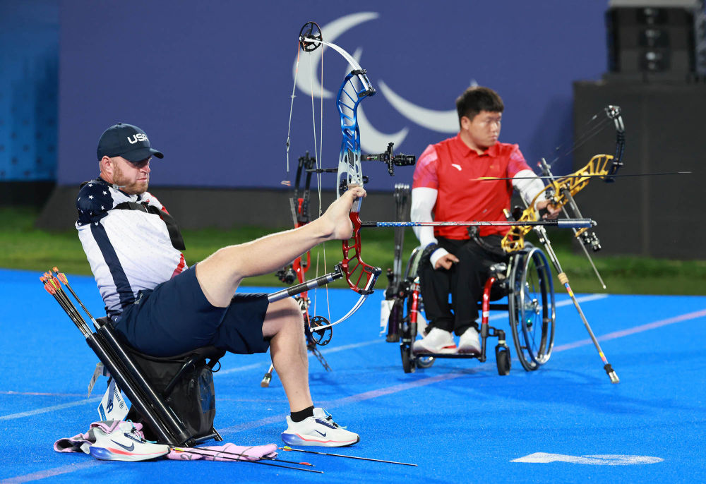 ↑9月1日,來自美國的無臂弓箭手、41歲的馬特·斯塔茨曼第四次在殘奧會賽場上向冠軍發起沖擊。最終,他獲得射箭男子個人復合弓公開級金牌。這是他首次在殘奧會上獲得該項目金牌。新華社記者 侯俊攝
