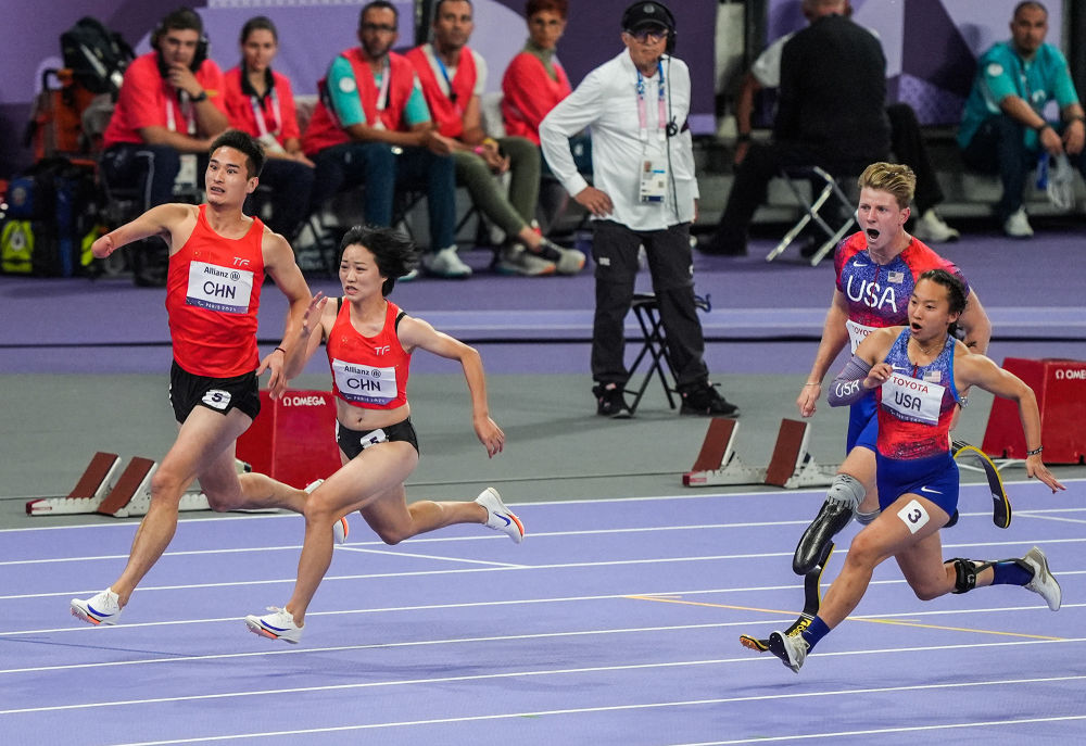 ↑9月6日,參加田徑4X100米混合接力的中國隊第二棒選手王浩(左一)與隊友文曉燕(左二)在比賽中接力。新華社記者 彭子洋 攝