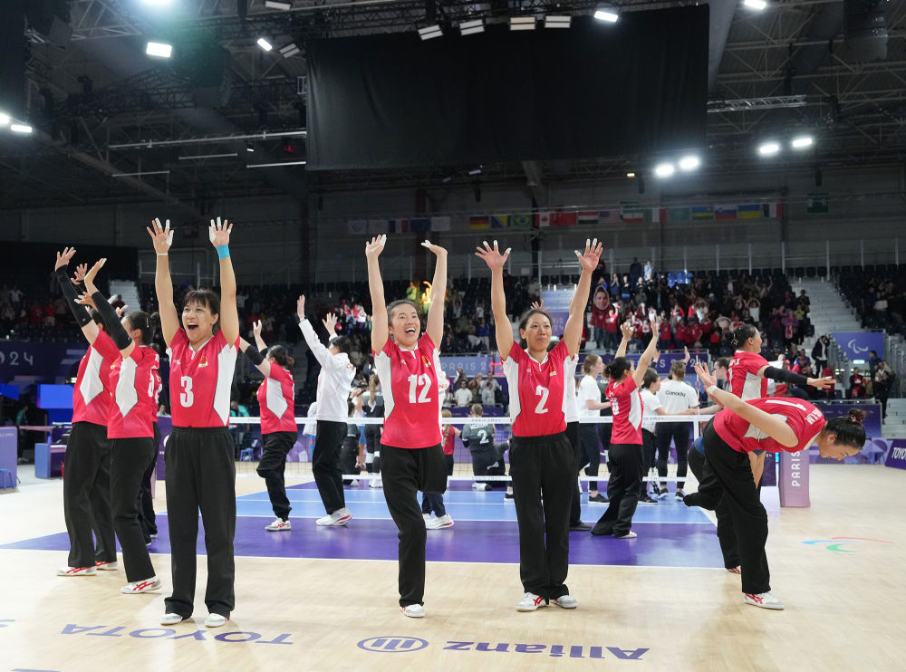 ↑9月5日,中國隊球員在女子坐式排球半決賽中戰勝加拿大隊,晉級決賽。這是她們賽后向觀眾揮手致意。 新華社記者 賀燦鈴 攝