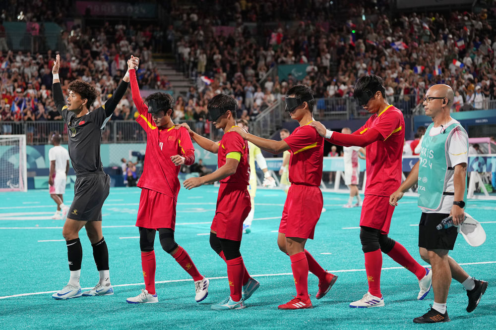 ↑9月1日,中國隊成員在盲人足球A組小組賽后向觀眾致意。新華社記者 熊琦 攝