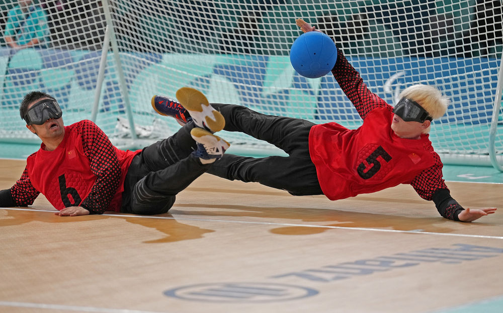 ↑9月2日,中國隊球員胡明耀(右)、余欽權在盲人門球男子四分之一決賽中奮力防守。 新華社記者 侯昭康 攝