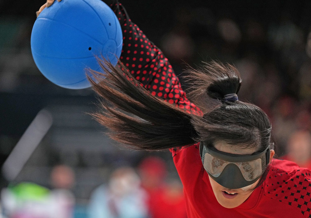 ↑9月3日,中國隊球員王春艷在盲人門球女子四分之一決賽中投球。新華社記者 侯昭康攝