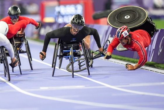 ↑8月31日,泰國選手普塔雷·孔叻(右一)在田徑男子5000米T54級決賽中摔倒。 新華社記者 張鋮 攝