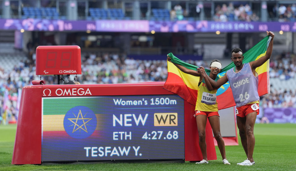 ↑9月2日,埃塞俄比亞選手特斯福(左)與領跑員吉爾馬在田徑女子1500米T11級決賽中,以4分27秒68的成績獲得冠軍并打破世界紀錄。新華社記者 才揚攝