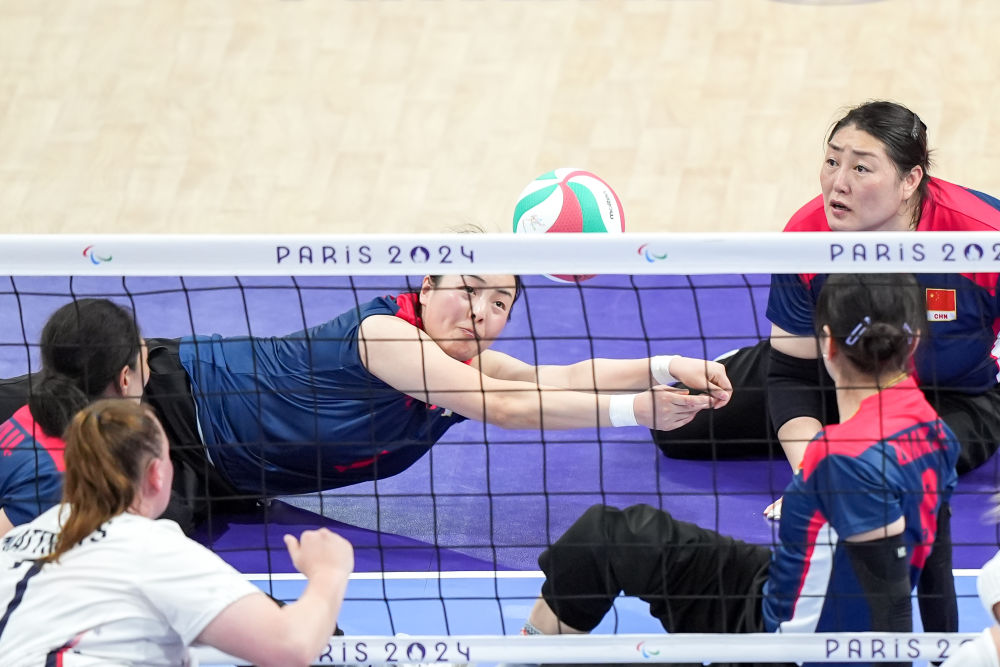 ↑9月7日,中國隊球員唐雪梅(中)在女子坐式排球決賽中救球。最終,中國隊獲得亞軍。汶川大地震幸存者唐雪梅因坐式排球擁有了“高光”人生。新華社記者 張鋮 攝