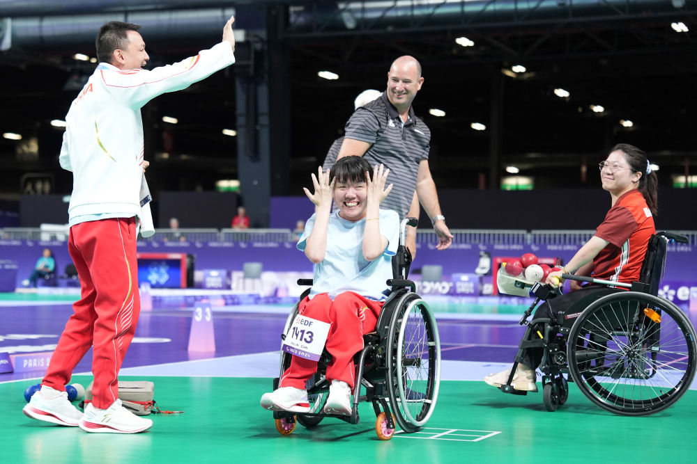 ↑9月2日,中國選手林細妹(中)獲得硬地滾球女子個人BC4級冠軍后喜極而泣。這是中國第一枚殘奧會硬地滾球項目金牌。 新華社記者 連漪 攝