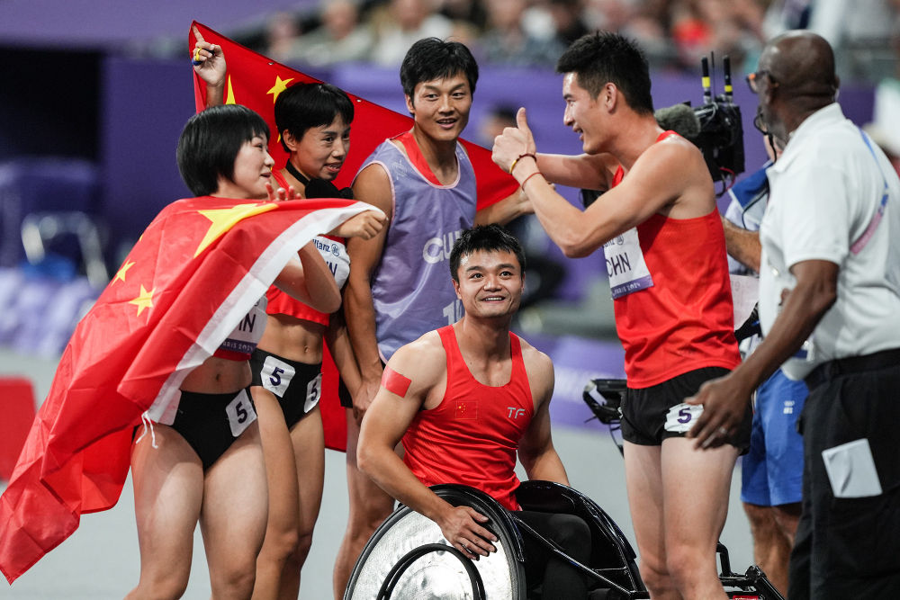 ↑9月6日,參加田徑4X100米混合接力決賽的中國隊選手王浩(右二)在賽后為隊友點贊。由周國華、王浩、文曉燕和胡洋組成的中國隊以45秒07的成績奪冠,并打破該項目世界紀錄。新華社記者 彭子洋 攝