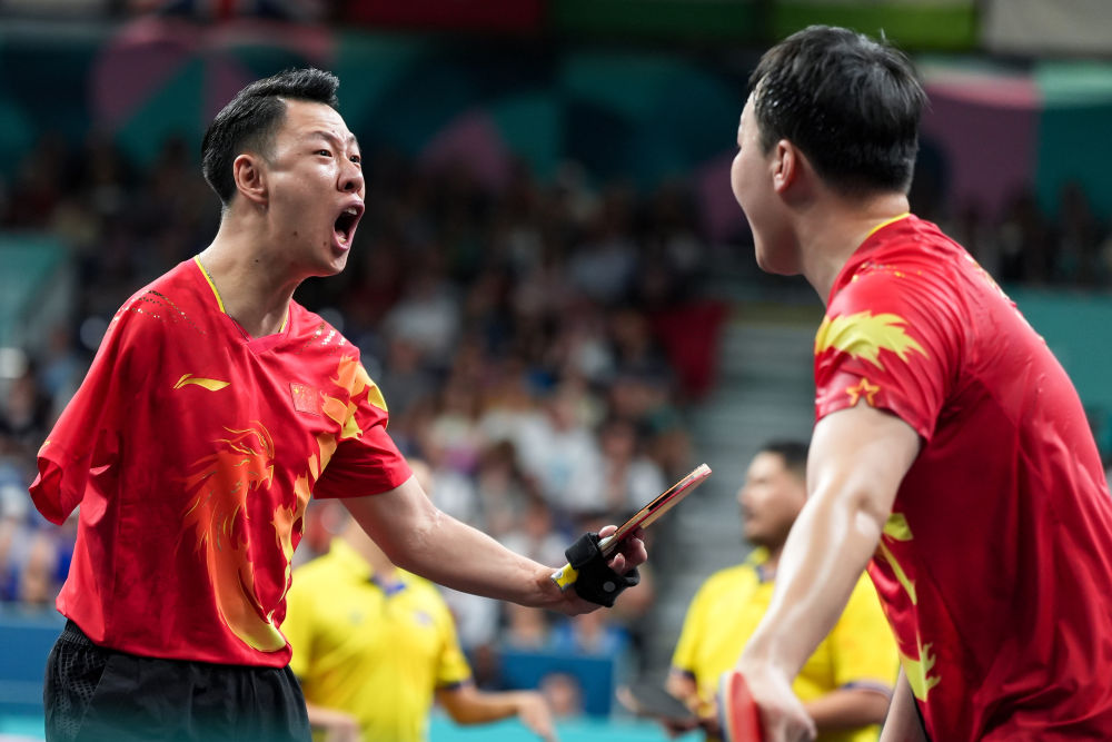↑8月29日,中國組合連浩/趙帥(前)在乒乓球男雙18級16強比賽中。新華社記者 侯昭康 攝