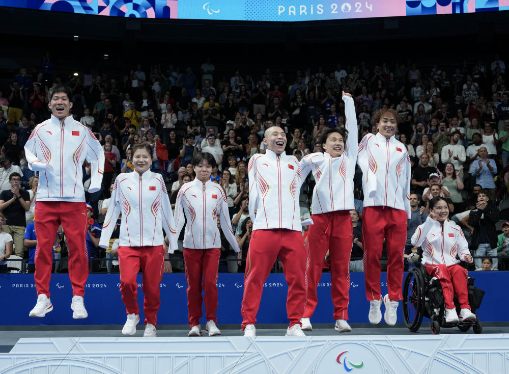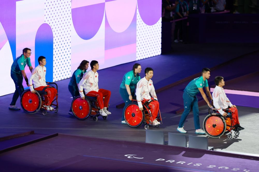 ↑9月5日,在輪椅擊劍男子花劍團體頒獎儀式前,巴黎殘奧會志愿者推著獲得冠軍的中國隊員沿坡道入場。新華社記者 侯俊 攝