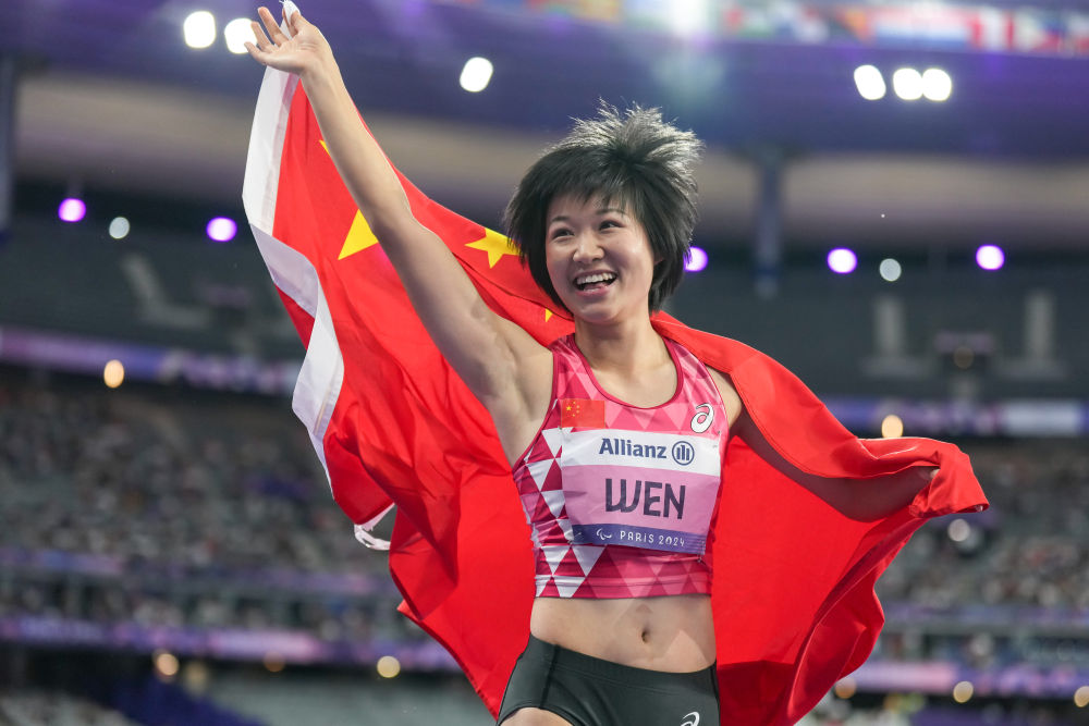 ↑9月1日,奪得巴黎殘奧會田徑跳遠T37級冠軍的中國選手文曉燕身披五星紅旗慶祝。新華社記者 張鋮 攝