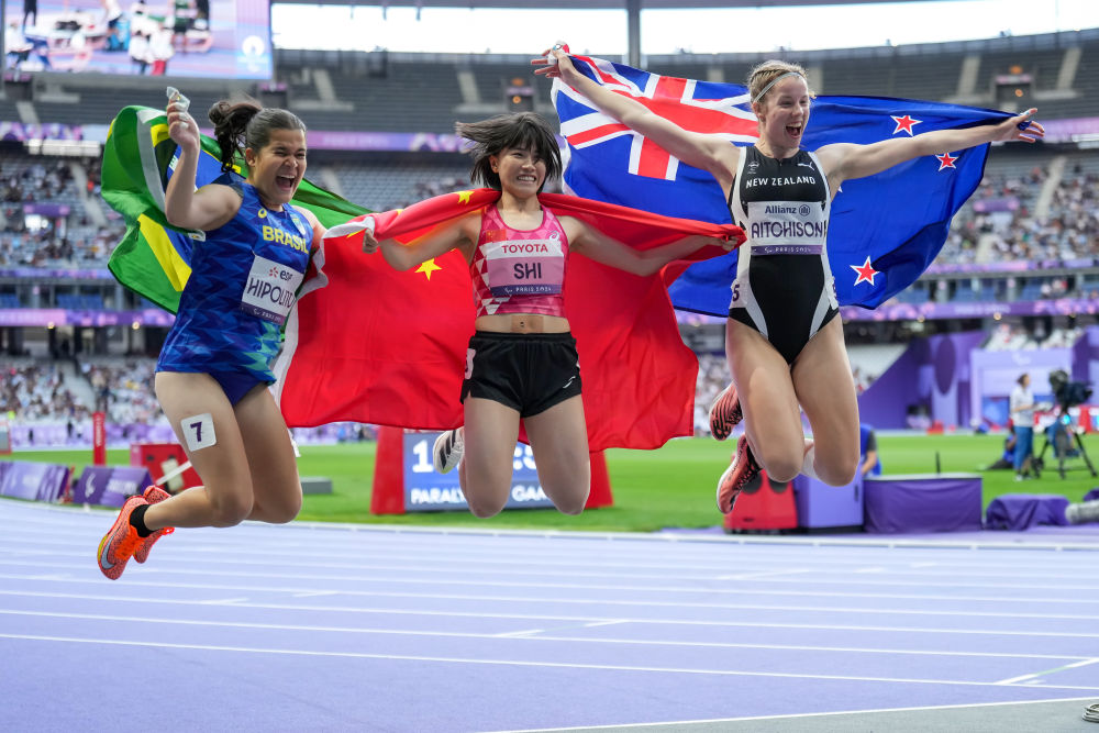 ↑9月4日,田徑女子100米T36級冠軍中國選手史逸婷(中)、亞軍新西蘭選手艾奇遜(右)和季軍巴西選手伊波利托一同躍起慶祝。新華社記者 張鋮 攝
