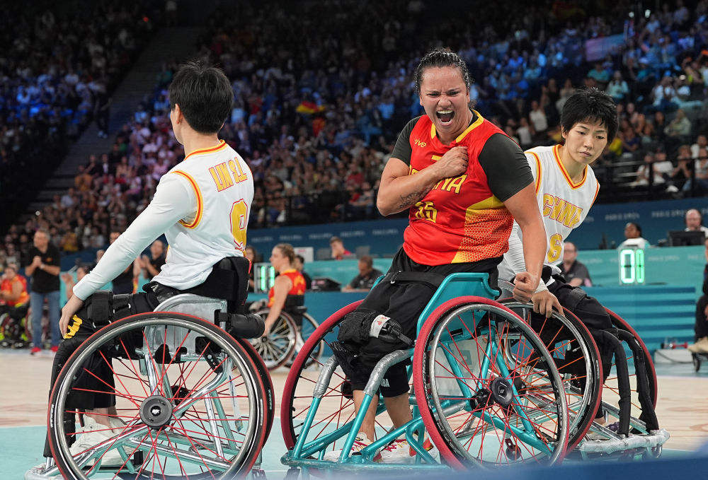 ↑8月30日,在巴黎殘奧會輪椅籃球女子小組賽A組第二場比賽中國隊對陣西班牙隊的比賽中,西班牙隊球員洛佩斯慶祝得分。新華社記者 高靜 攝