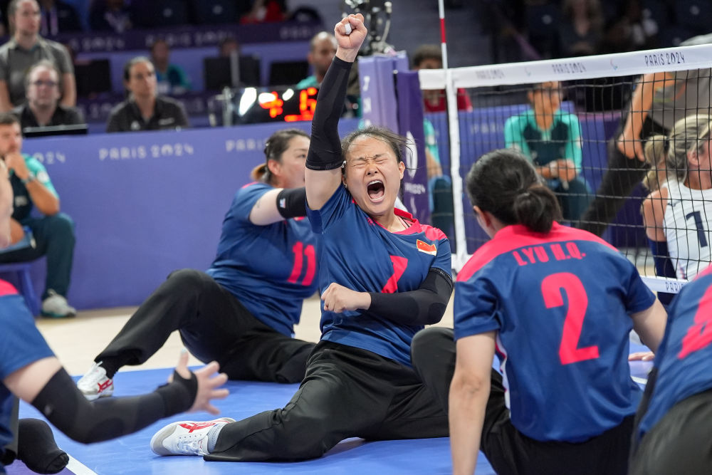 ↑ 9月7日,中國隊球員王亞男(中)在女子坐式排球決賽中慶祝得分。新華社記者 張鋮 攝
