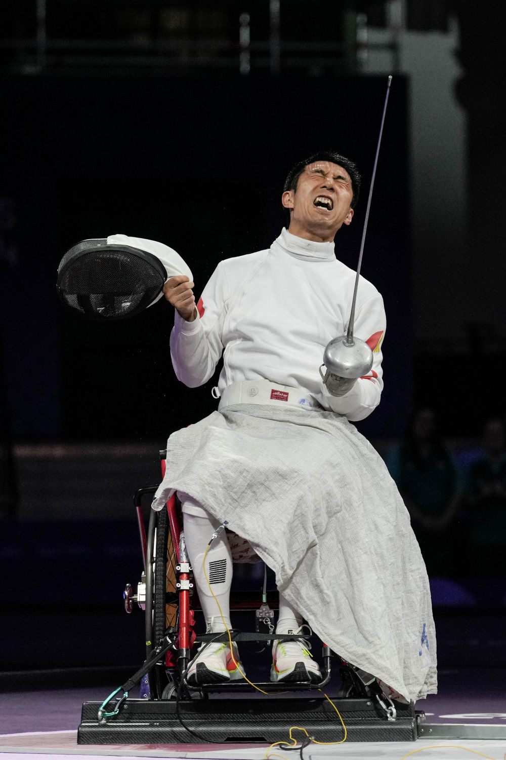 ↑9月6日,中國選手孫剛在獲得輪椅擊劍項目男子個人重劍A級冠軍后慶祝。新華社記者 張豪夫 攝