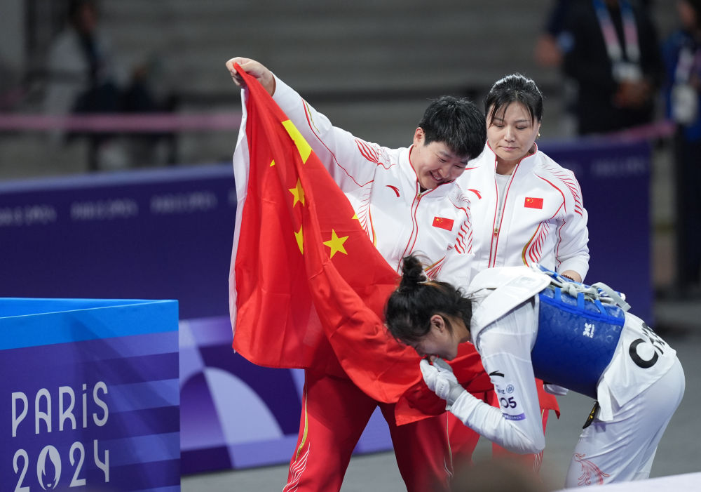 ↑8月30日,中國選手李羽潔(下)奪得跆拳道女子57公斤級K44級金牌后親吻國旗。新華社記者 漣漪攝