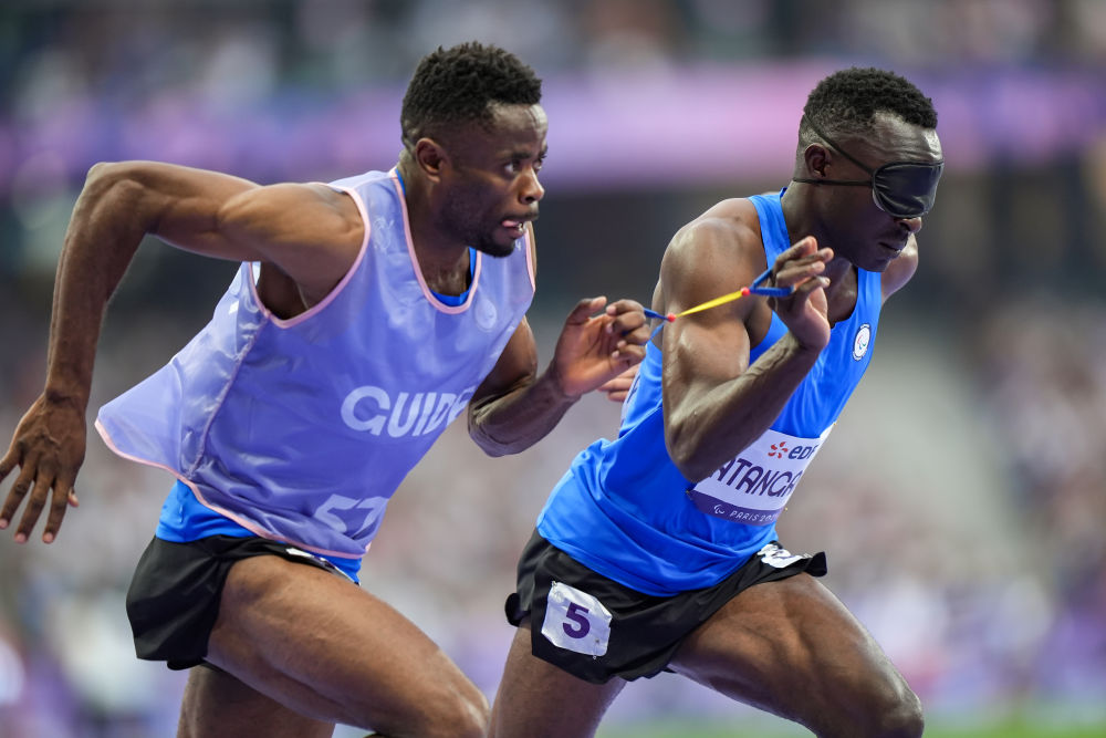 ↑8月31日,難民代表團選手阿坦加納(右)和領跑員尼亞姆朱亞在田徑男子400米T11級半決賽中。新華社記者 張鋮 攝